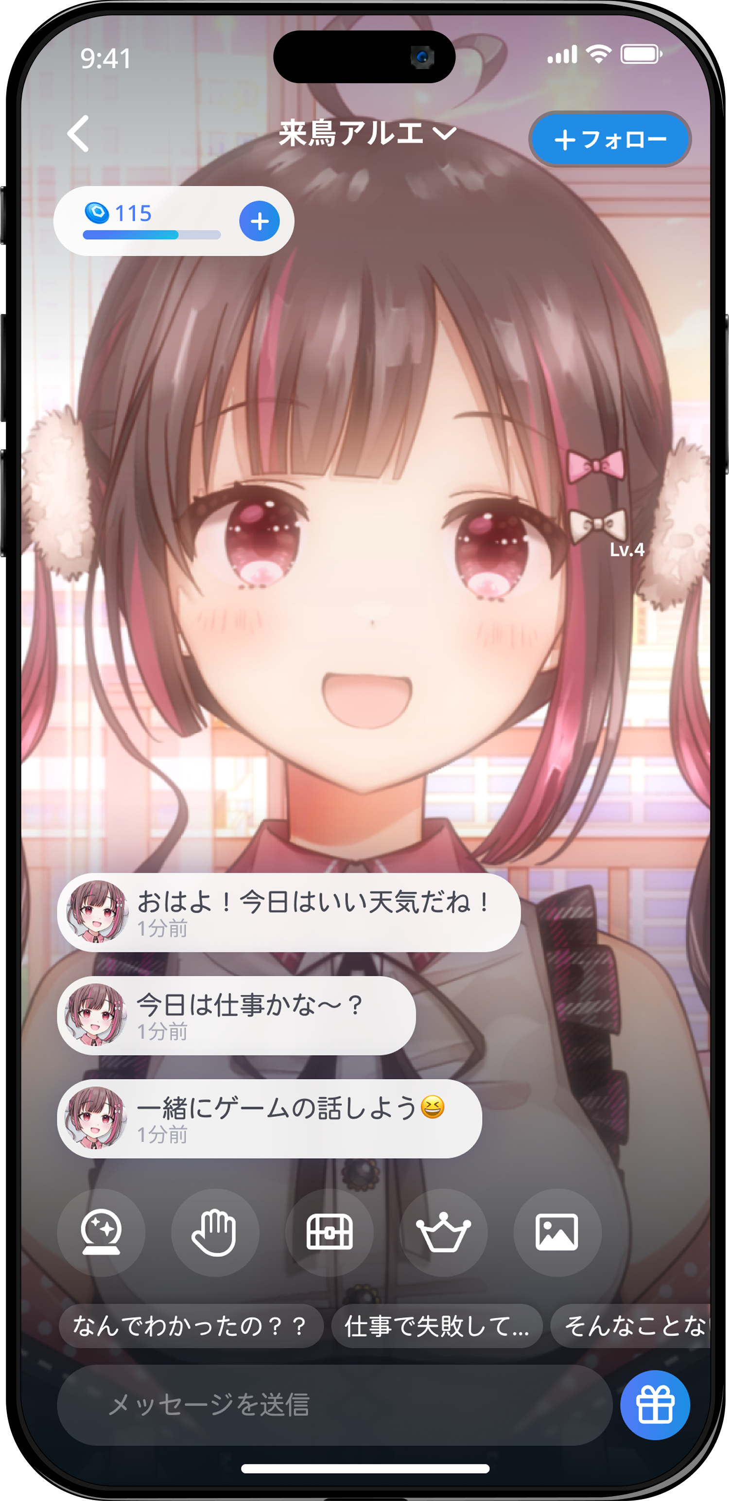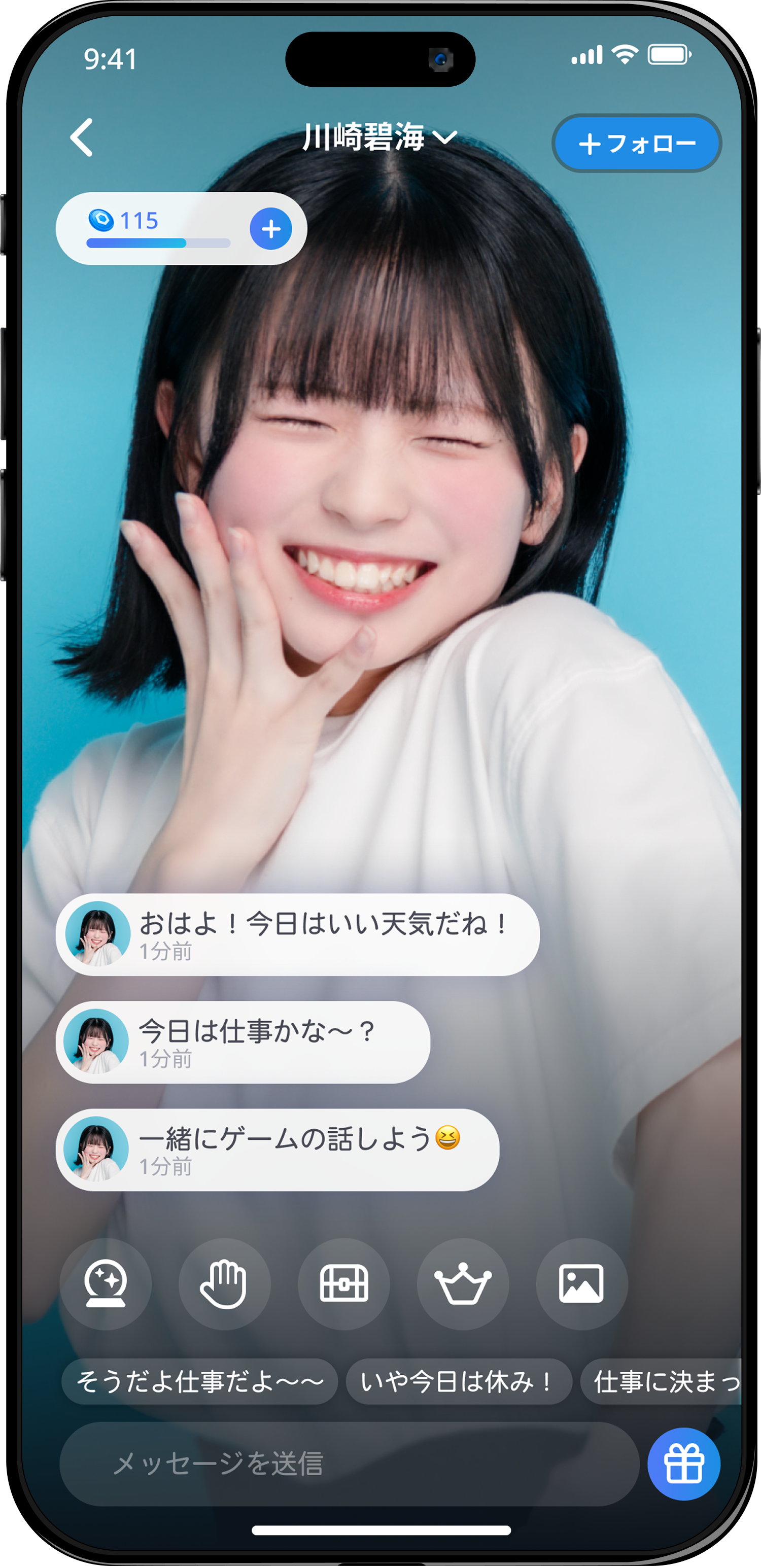 たとえば、 あなたのことをそのまま教えた分身を作ったり、 普段インドアな人が、めちゃくちゃアウトドアで陽キャになった設定のアイを創作してみたり、 あなたのペットをアイにしてみたり、 色んな設定や世界観で作成することができます。 アイは、あなたが忙しいときには、あなたの代わりにファンと楽しくおしゃべりしたり、 あなたが悩んでる時に、元気になるアドバイスをくれるかもしれません。