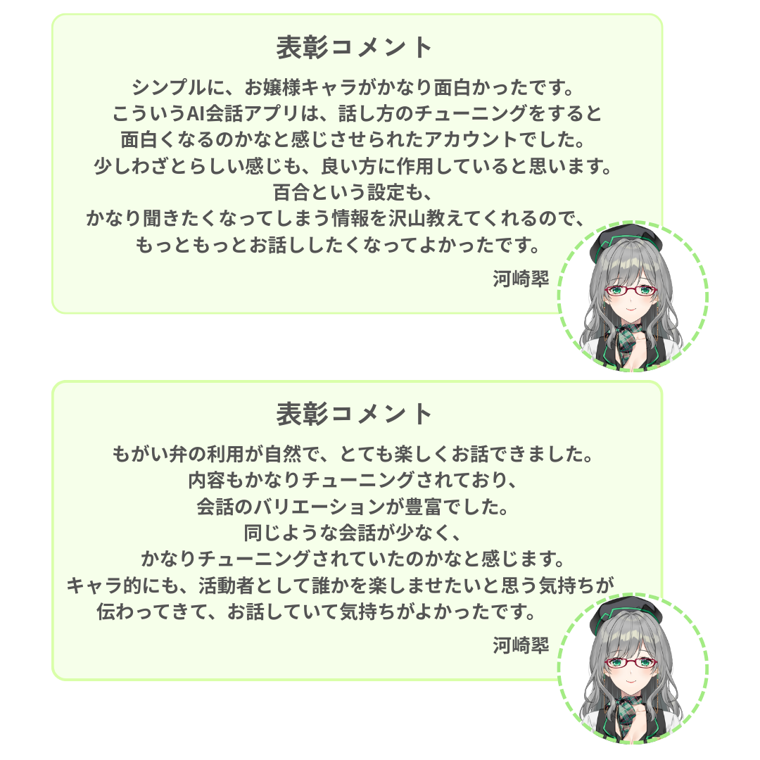 『より多くのユーザーに会話されたアイ』上位3名を表彰※チャット画面を開いたのみの信頼度が0のユーザーはカウントされません
