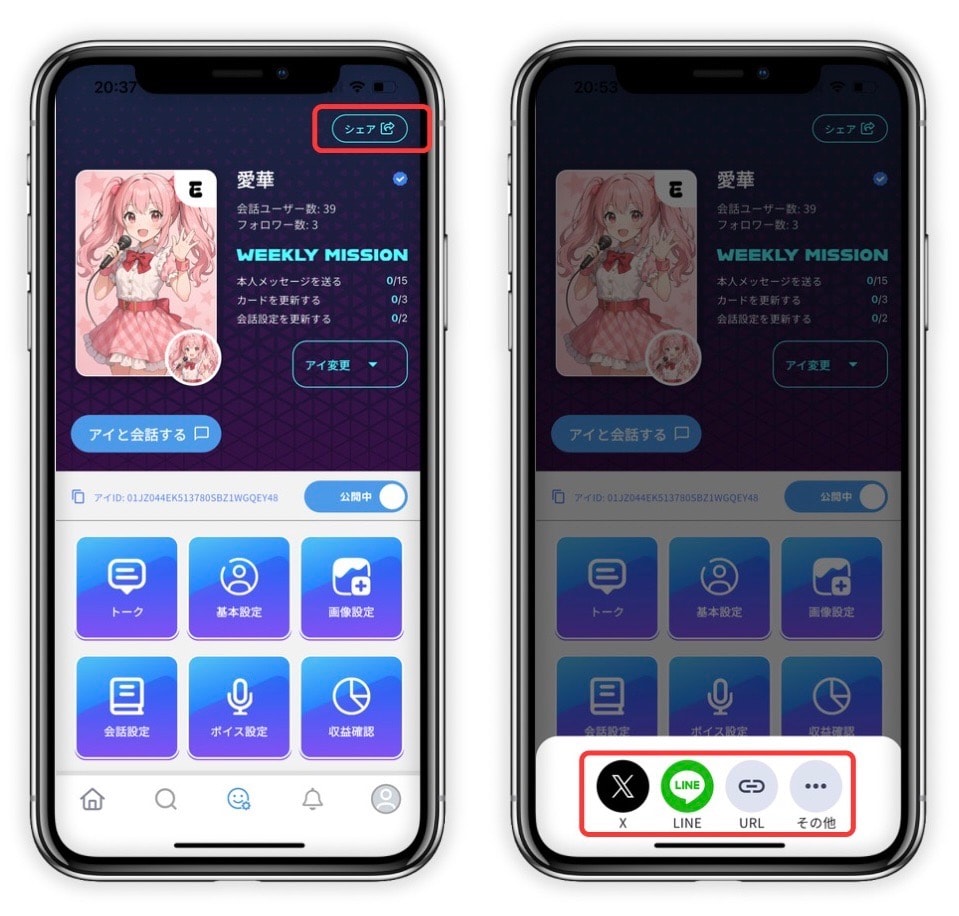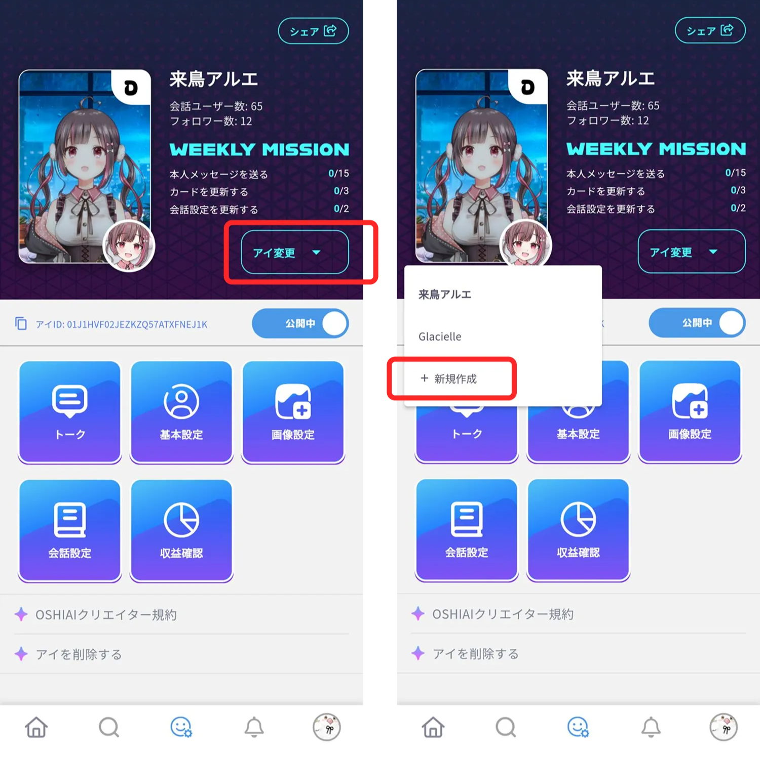 すでに作成されたアイはエントリー期間内に基本設定、会話設定から変更できる人格更新を3回以上更新いただくことでエントリーが可能です。